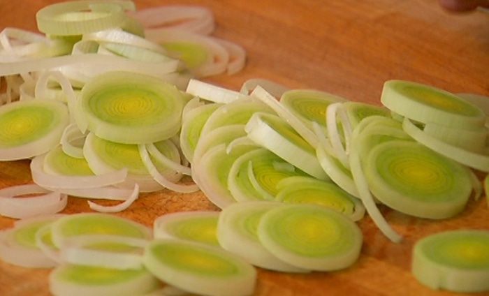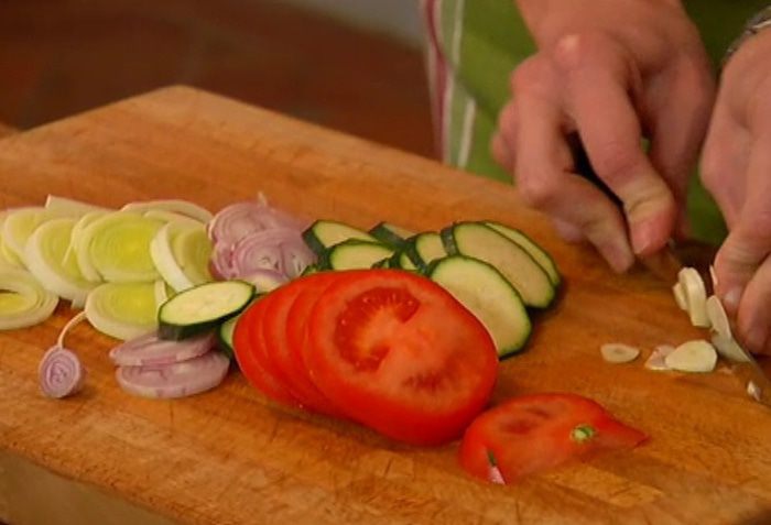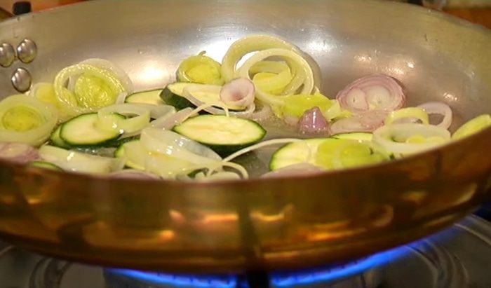 Разогреть в глубокой сковороде 1 ст. ложку оливкового масла и обжарить весь лук и цукини.