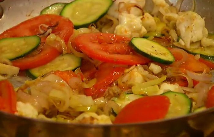 В сковороду с цукини и луком выложить цветную капусту, помидор и чеснок, перемешать, посолить, поперчить, добавить пудру карри и сахар, перемешать, обжаривать еще буквально минуту, затем снять с огня.