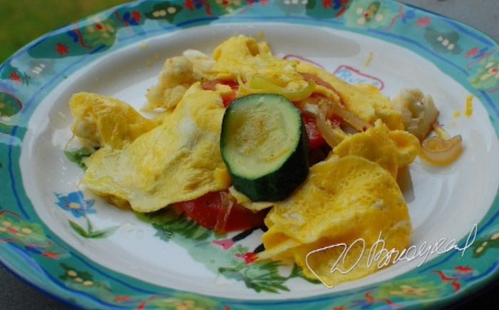 Выложить на тарелку овощи, а сверху яичные «кружева».