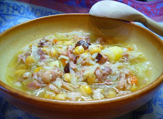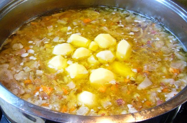 На оливковом масле потомить сало вместе с луком, морковью, чесноком.