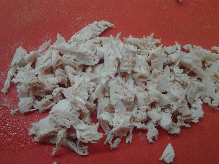 Куриную грудку отварить. Охладить и нарезать соломкой.