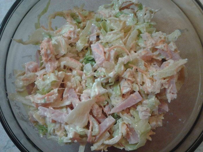 Все ингредиенты смешать, добавить морковку. Заправить майонезом.
