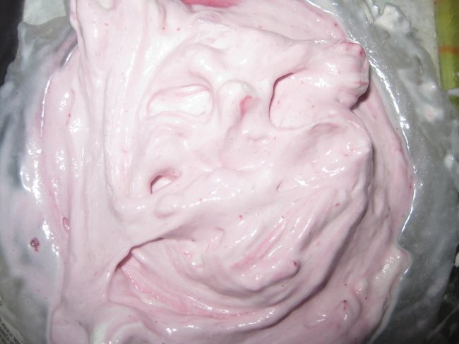 Делаем крем: Сливки взбиваем с сахарной пудрой. И аккуратно добавляем сок от перетертой с сахаром клубники.