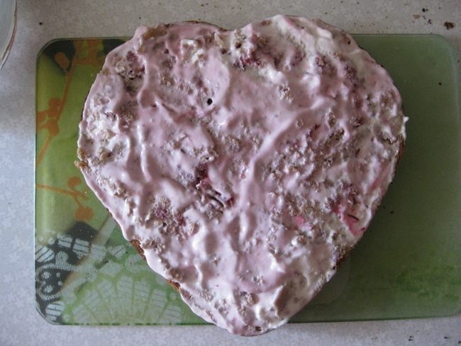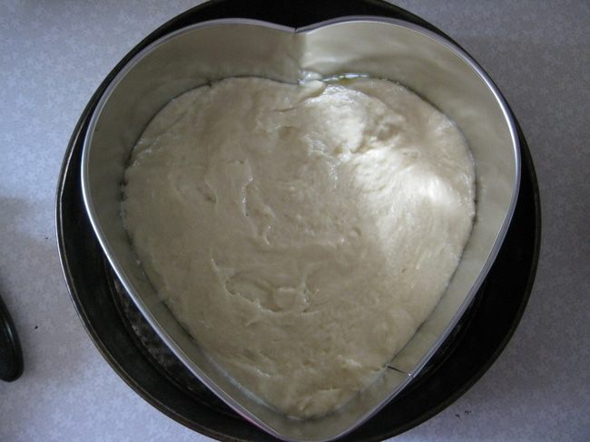 Противень смазываем сливочным маслом. На пару секунд можно поставить его в духовку, чтобы масло растаяло. Половину полученного теста выкладываем в форму сердце. И ставим в разогретую духовку на 30-40 минут.