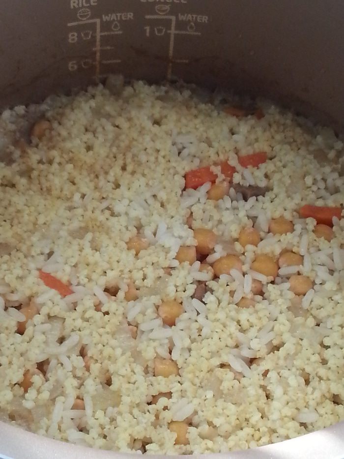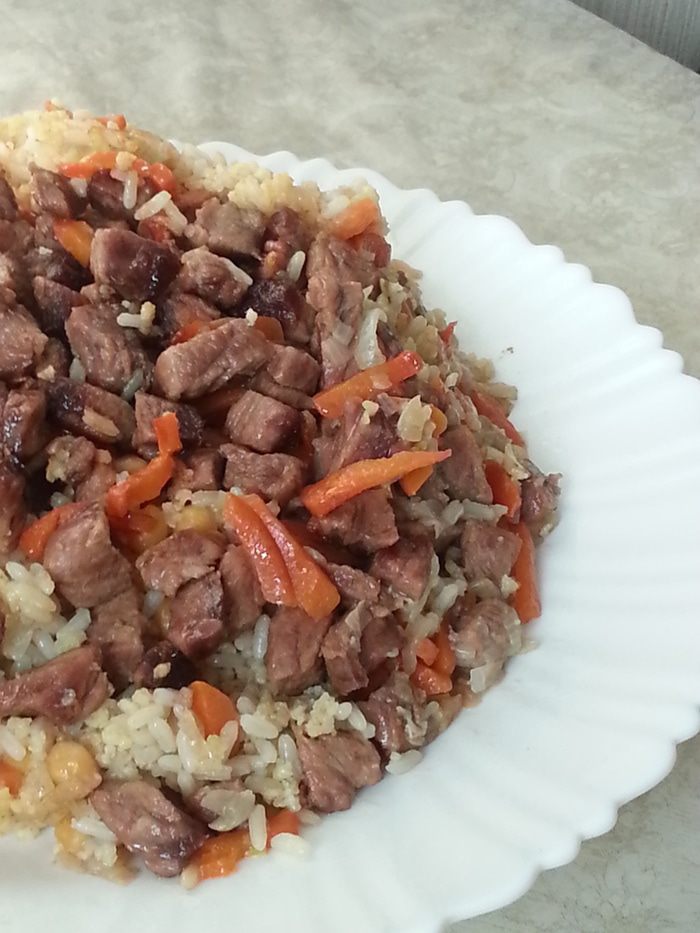 Этот плов был придуман для того, чтобы ввести в рацион пшено и нут, которые более полезны чем белый рис. Сначала добавляла пшено по чуть-чуть, а сейчас 1:1. А горох Нут он теперь даже любит (как оказалось!!!).