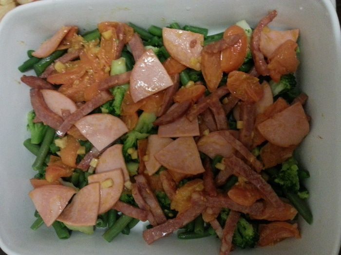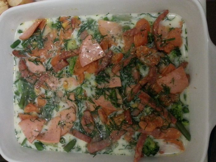 Все очень просто - отвариваем те овощи, которые можно отварить (чаще всего - стручковая фасоль, брокколи, цветная капуста, брюссельская капуста, зеленый горошек), обжариваем все остальное (помидоры, болгарский перец). Заливаем смесью яиц и молока, посыпаем сыром и запекаем. Правильнее сделать с куриной грудкой, а не с колбаской, но семья настояла на использовании именно колбасы.