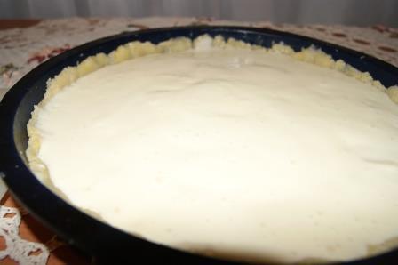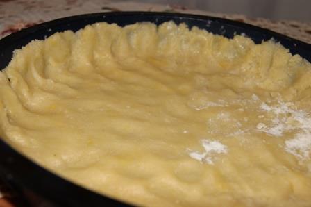 Прежде всего готовим тесто. Холодное масло порезать кубиками, смешать с сахаром и мукой в крошку, добавить яйцо. Замесить тесто. Тесто выложить в форму, отправить в холодильник на 30 минут.