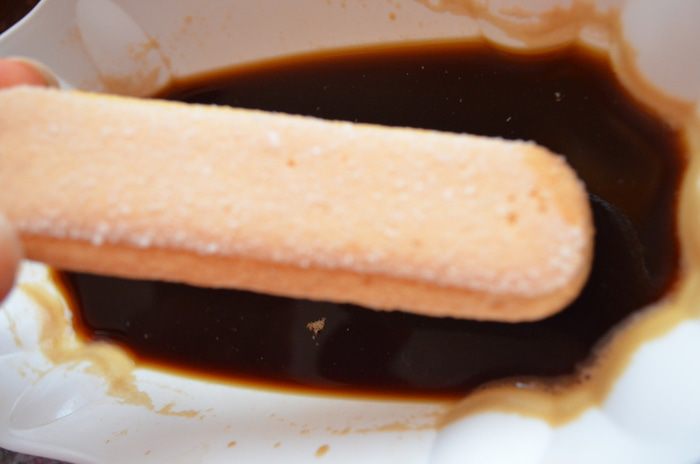 Свежесваренный эспрессо остужаем. Форму застилаем пищевой пленкой. Печенье окунаем в эспрессо и мгновенно достаем.