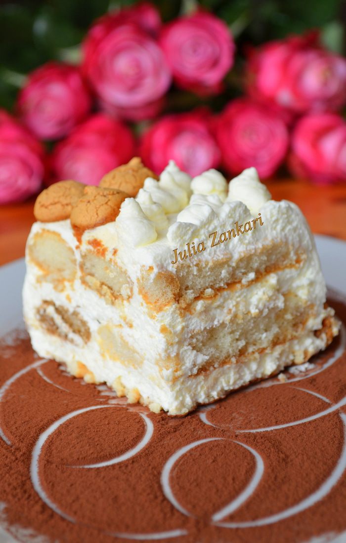 Предлагаю тирамису с творожным кремом. Делала к годовщине свадьбы. Решила заменить маскарпоне на нежирный пастообразный творог. Мужу и гостям пришелся по вкусу. А печенье амареттини придают особенный вкус.