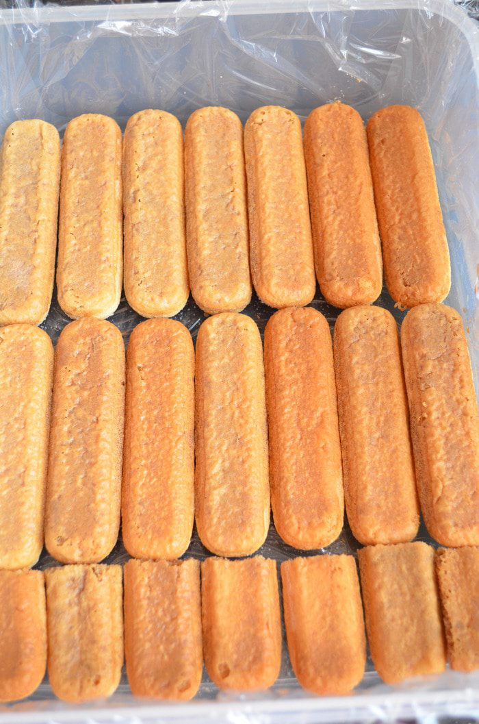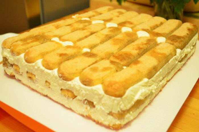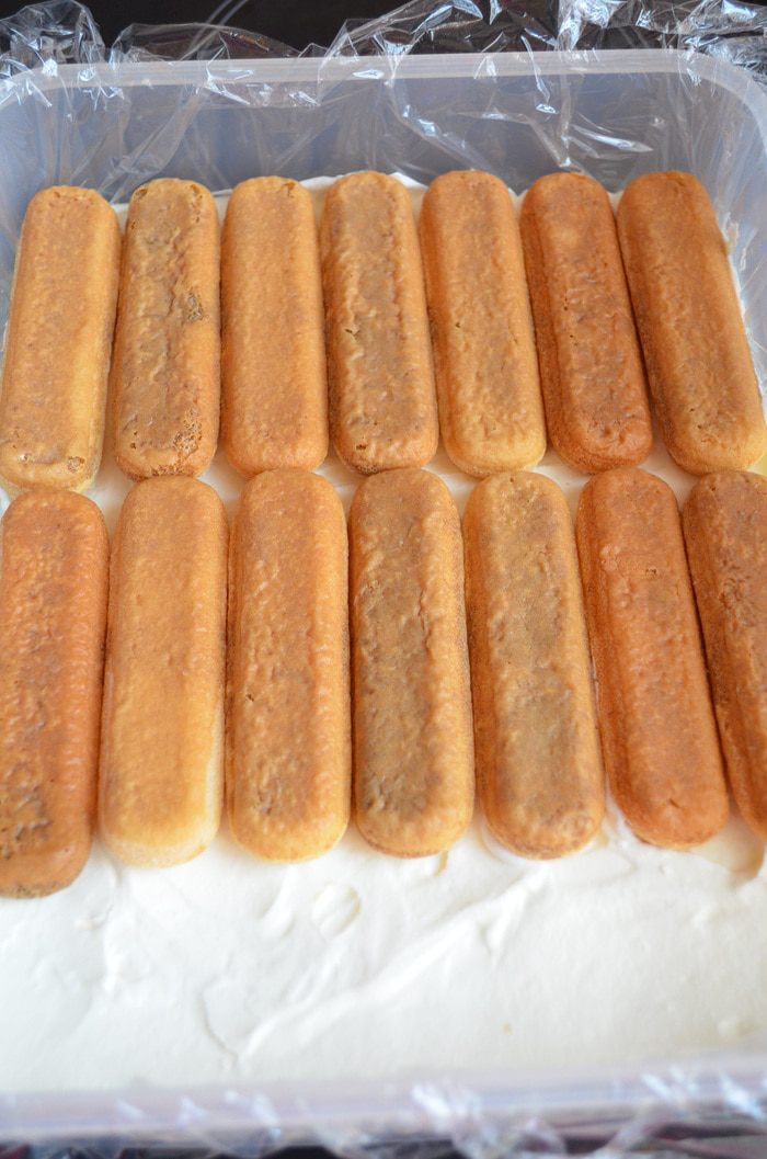 Второй слой также наполняем кремом ровно разглаживая.Последний слой крема я накрыла печеньем крокет,т.к. не хватило савоярди.Накрываем пищевой пленкой и в холод на несколько часов.