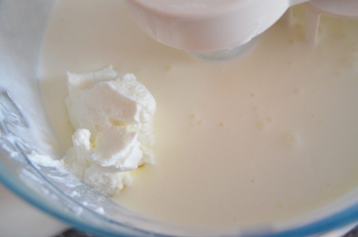 Начинаем взбивать сливки с загустителем, постепенно вводим пастообразный творог.