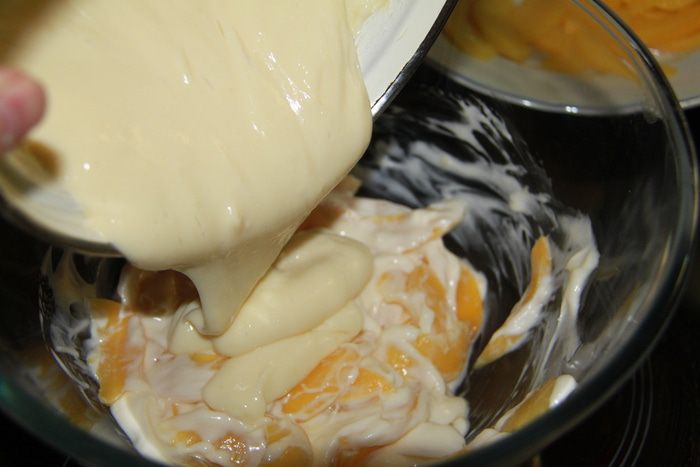 Добавить взбитые сливки в общую массу и осторожно перемешать. Убрать в холодильник.