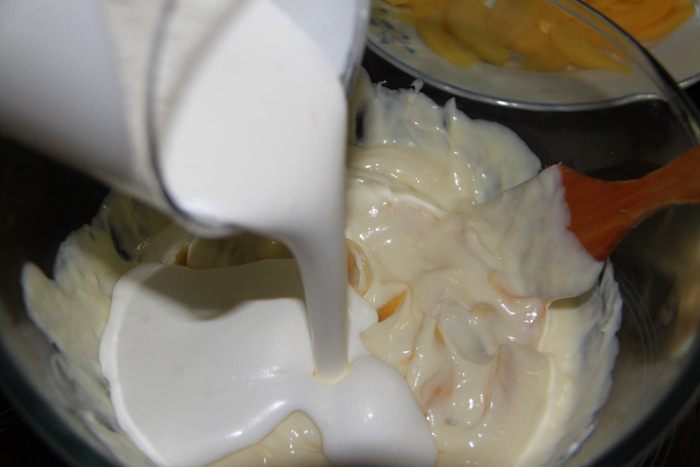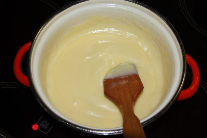 Готовим заварной крем. Взбить желтки с сахаром, добавить муку и медленно влить горячее молоко. Довести до кипения и варить около 5 минут, перемешивая деревянной ложкой, пока крем не станет плотным. Отставить в сторону и дать крему остыть.