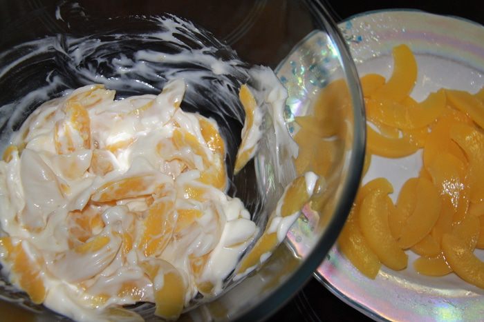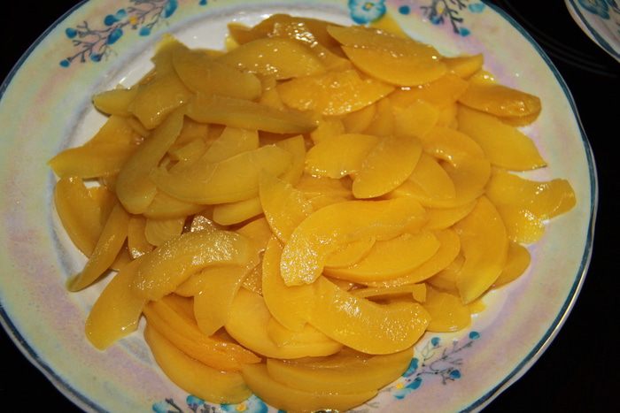 Вынуть персики из сиропа и разрезать на небольшие кусочки или лепестками.
