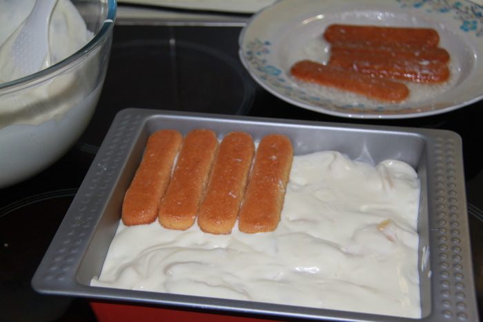 Замочить каждую печенюшку в персиковом сиропе. Выложить в форму слой печенья. Затем слой крема. Повторяем, пока не закончится печенье и крем.