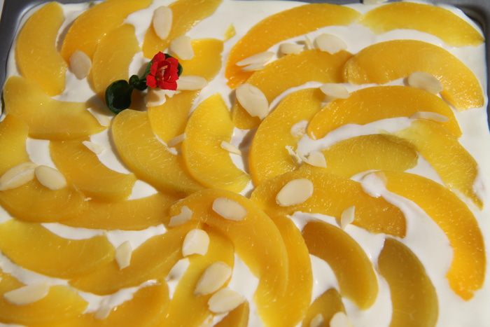 Верх украсить дольками персика и миндальными лепестками. Оставить в холодильнике на 2-3 часа.