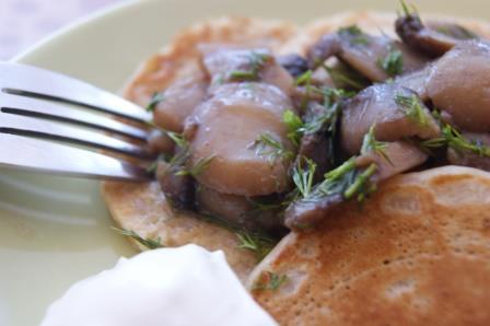 Готовые блинчики выложить по тарелкам, сверху выложить грибы, подавать со сметаной. Приятного завтрака!
