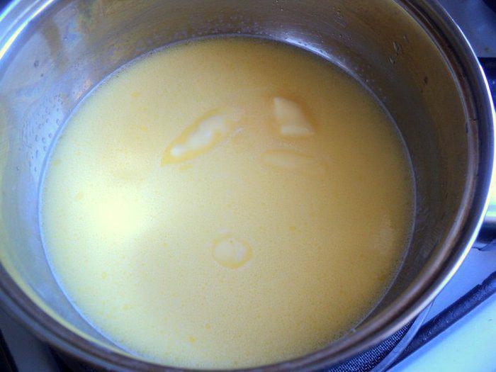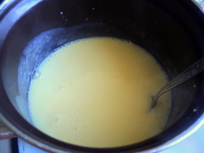 В молоко (200 мл) добавить сахар и ванильный сахар, довести до кипения. В 50 мл холодного молока добавить крахмал, желток и размешать до однородной массы. Тонкой струйкой влить в горячее молоко и, постоянно помешивая, довести до загустения (не кипятить!). Накрыть пищевой пленкой и охладить.