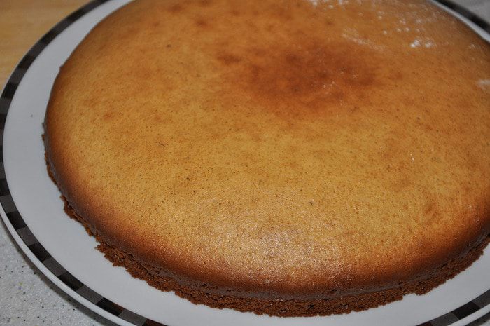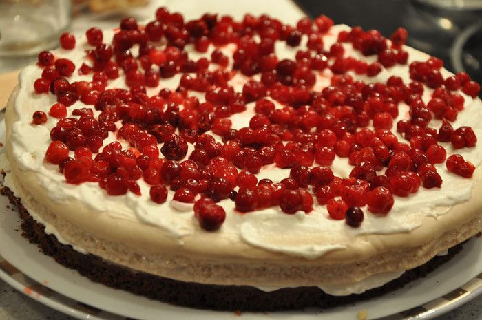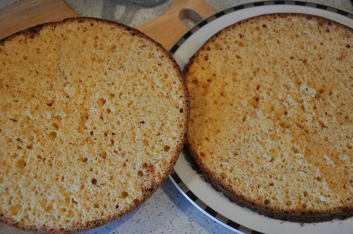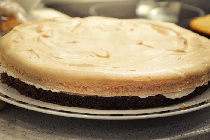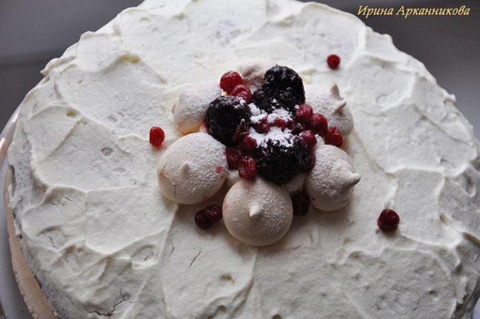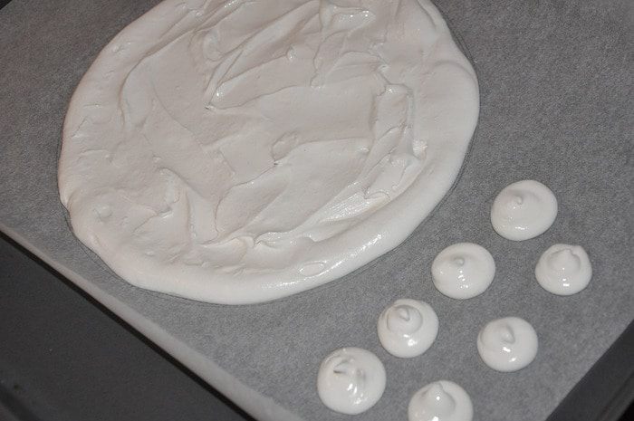 Тем временем приготовить корж безе. Для этого взбивать белок с щепоткой соли около минуты. Затем постепенно добавлять пудру и взбивать на средней скорости до пиков. Нарисовать круг на пергаменте по размеру форму коржа из бисквита. Выдавить крем на круг + несколько безешек для украшения. Выпекать при 150 гр около 15 минут. Чтоб серединка осталась мягкой.