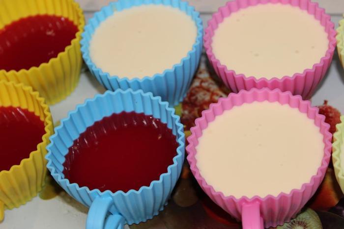 Я использую агар-агар. Но вполне подойдет желатин. Некоторое сравнение: 1. Желатина требуется в два раза больше по объему (на 100 мл. жидкости желатина нужно 2 грамма, агар-агара - 1 грамм). 2. Масса с желатином не подлежит вторичному нагреву и застыванию, а при использовании агара массу можно нагревать снова и снова, если вдруг она быстро застынет. 3. Агар-агар застывает даже при комнатной температуре, а желатин только при охлаждении и на это уходит больше времени.