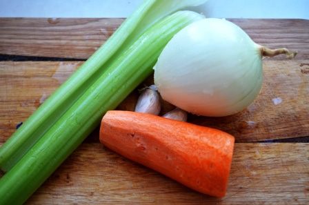 Подготовить овощи: лук, морковь и сельдерей нарезать на одинаковые кубики.