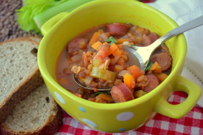 Согревающая чечевичная похлебка с копчеными сосисками