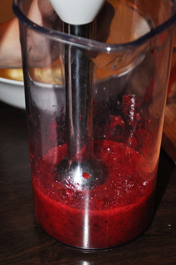 Приготовить соус: бруснику взбить с сахаром погружным блендером. Вылить с маленькую кастрюльку, добавить крахмал, хорошо размешать. Поставить а медленный огонь и прогревать до загустения. Закипеть не должно. Остудить.