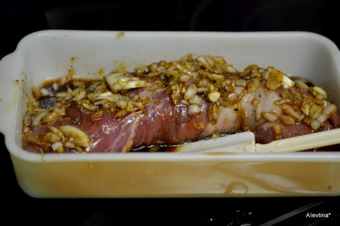 Добавить свинину, перевернуть чтоб она была в маринаде и поставить, закрыв пленкой в холодильник на час или более. Я для усиления вкуса мариную утром и к ужину ее готовлю.