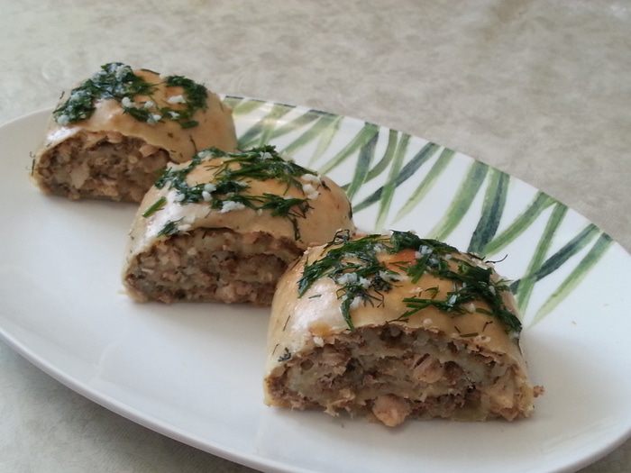 Очень тонкое невесомое тесто, богатая начинка, в состав которой входит полезная печень. Мои мужчины, да и я вместе с ними, кушают этот рулет с удовольствием. Готовится достаточно легко и просто. Можно использовать отварную лапшу, но у нас она и так частенько на столе, поэтому я использую рис.