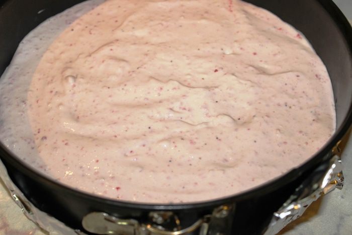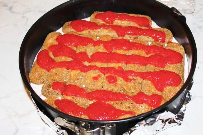 Подготовить разъемную форму: дно выстелить пергаментом или фольгой, сомкнуть бортики. Снаружи тоже можно обернуть фольгой (во избежание подтеков пропитки или крема).