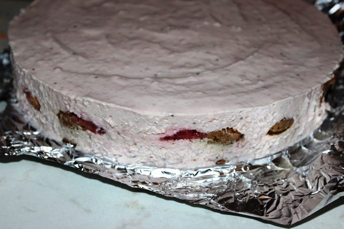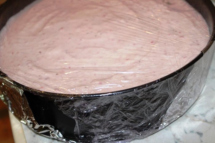 Выложить сверху остаток крема, разровнять его. Накрыть форму пленкой и поставить в холодильник часа на 2.
