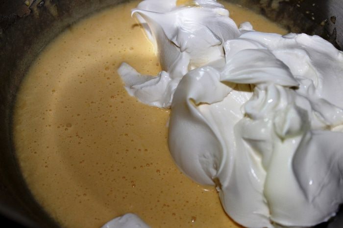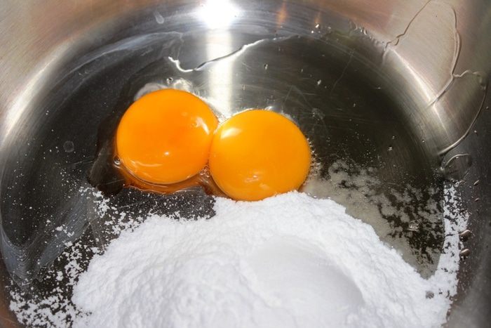 Для крема: желтки куриных яиц взбить с сахарной пудрой и ликером.
