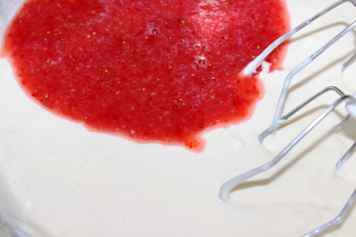 3/4 части полученного клубничного пюре добавить в крем, а остальную часть (1/4) пока поставить в холодильник (пригодится при сборке торта).
