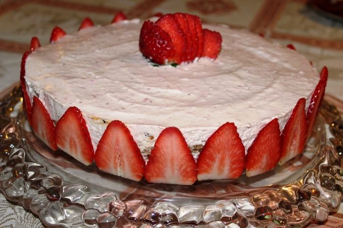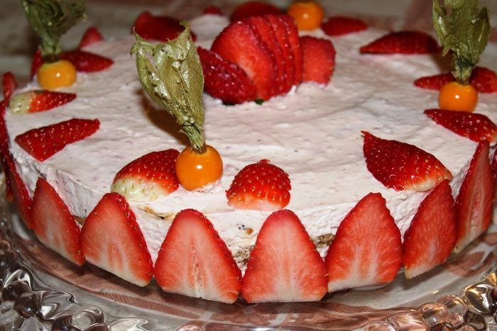Аккуратно перенести торт на сервировочное блюдо. Для украшения клубнику лучше брать крупную. Нарезать ее пластинками и разместить их по всему периметру. Далее украсить торт по своему желанию и вкусу.
