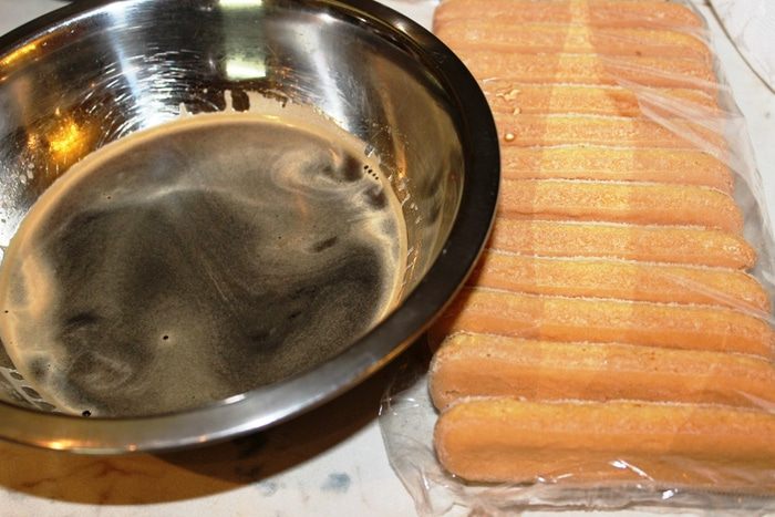 Сварить свежий крепкий кофе, подсластить его и вылить в широкую миску. Подготовить печенье.
