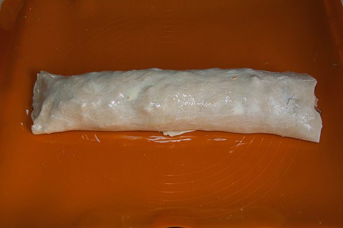 Раскатываем получившееся тесто на силиконовый коврик или полотенце присыпанное мукой (чтобы легко было свернуть в рулет).