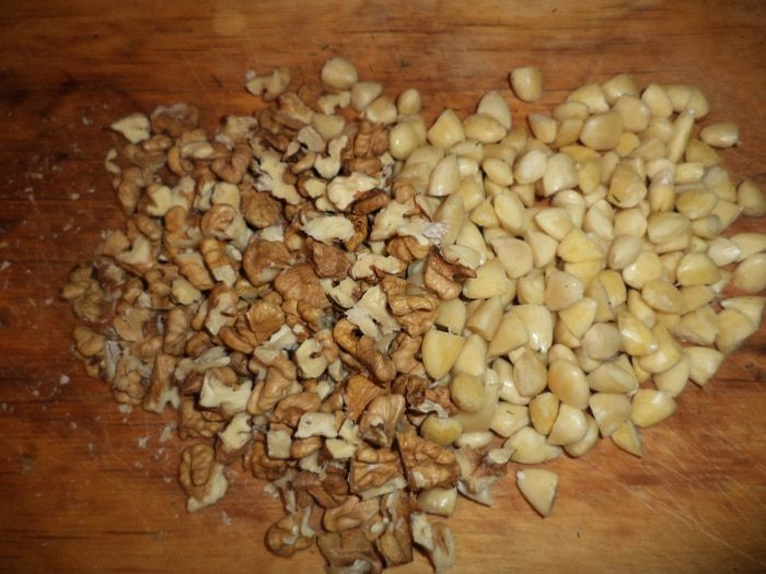 Миндаль залить кипятком на 10 минут. Воду слить, миндаль очистить и порубить на довольно крупные кусочки. Грецкие орехи тоже крупно порубить.