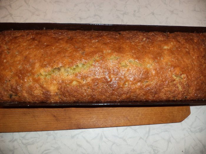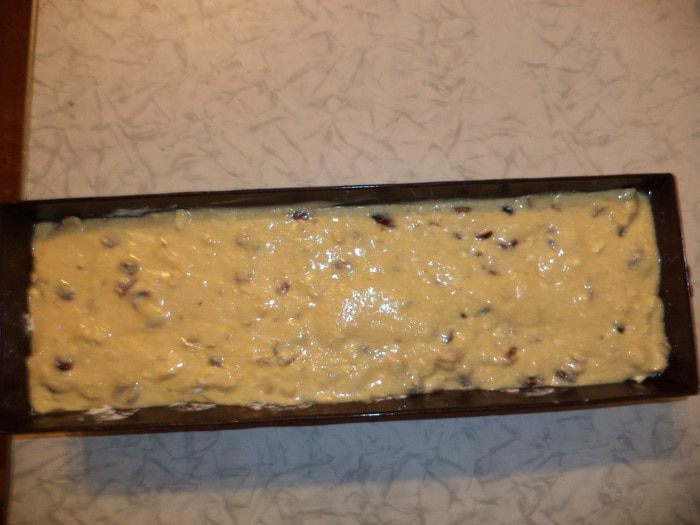 Продолговатую форму для выпечки кекса смазать маслом, присыпать мукой. Выложить тесто. Выпекать при температуре 180 градусов 60 - 70 минут.