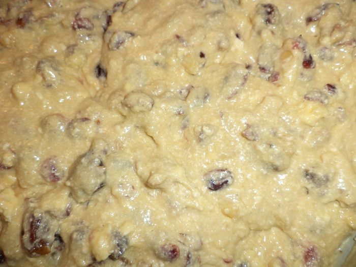 Муку перемешать с разрыхлителем. Несколькими ложками мучной смеси посыпать фруктово - ореховую смесь, перемешать. Основную часть муки всыпать в масляно-яичную смесь, перемешать. Добавить фруктово - ореховую смесь и коньяк.