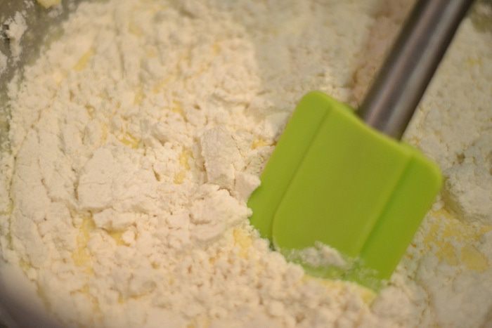 Отдельно просеять муку с разрыхлителем и замесить тесто. Я половину порции с мукой взбила на небольшой скорости в комбайне, чтобы не было комочков, а остальную порцию муки вымесила лопаточкой.