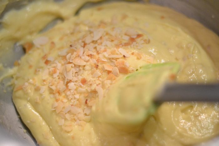 Добавить к тесту миндаль, предварительно его раскрошить, у меня обжаренные пластины, перемешать лопаткой.