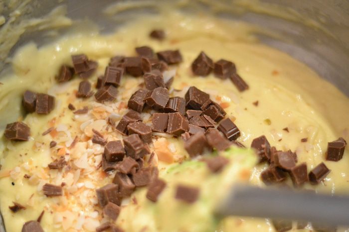 Шоколад поломать на кусочки и также добавить к тесту, перемешать.