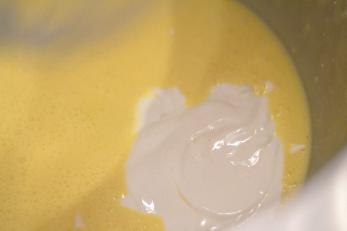 Добавить по одному яйца комнатной температуры и снова хорошо взбить. Добавить сметану, ванильную эссенцию, взбить до однородности.