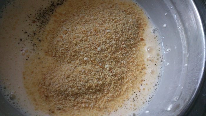 Добавить в смесь сухари и приправить солью и перцем. Смешать.