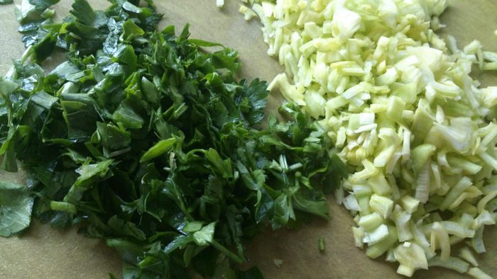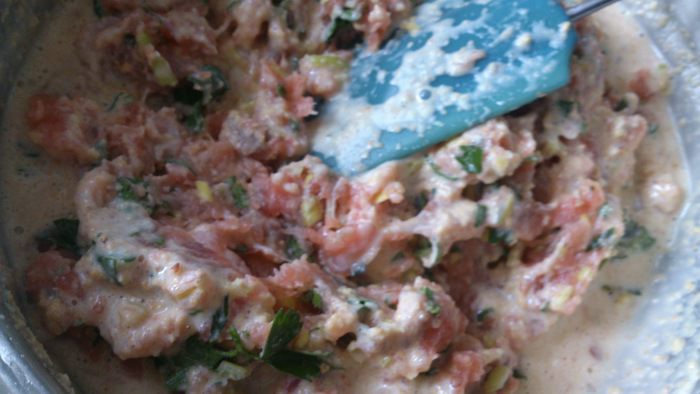 Добавить лосось, лук и зелень. Хорошо перемешать.