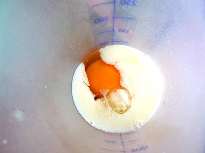 В шейкер вбиваем крупное яйцо и вливаем теплое молоко.