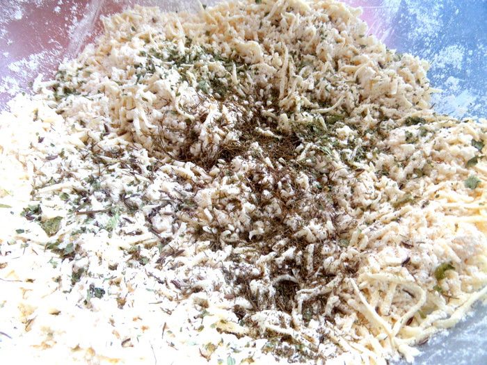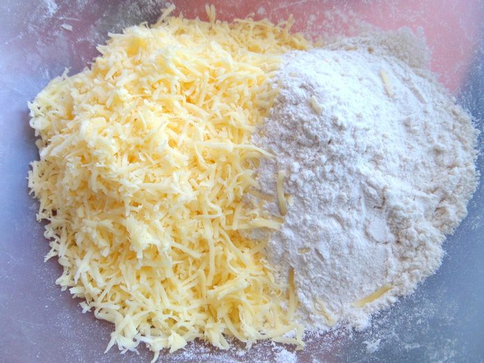 Высыпаем примерно по чайной ложке в сыр с мукой.