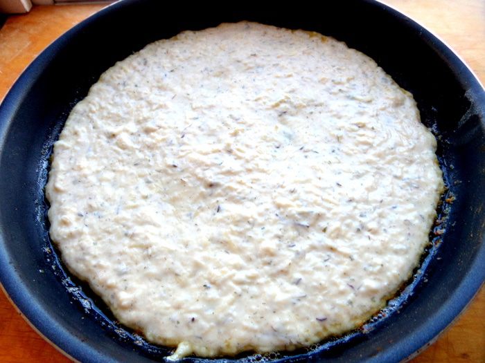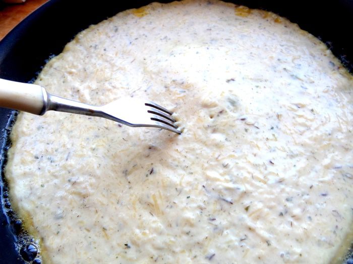 Лепешка может подниматься в центре, поэтому я наколола её вилкой. Жарим на среднем огне.
