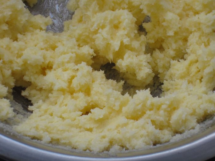 Ввести яйца, просеянную муку с разрыхлителем, щепотку соли, лимонную цедру, сок и цедру апельсина, цукаты. Тщательно перемешать.