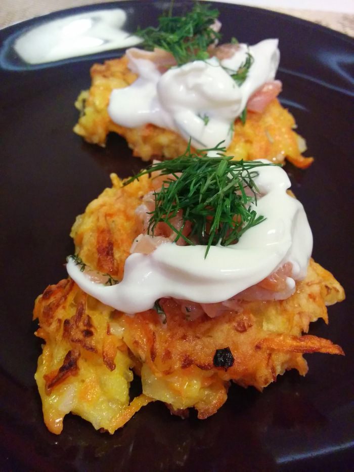 Подаем оладушки с лососем, сметаной и зеленью. Приятного аппетита!